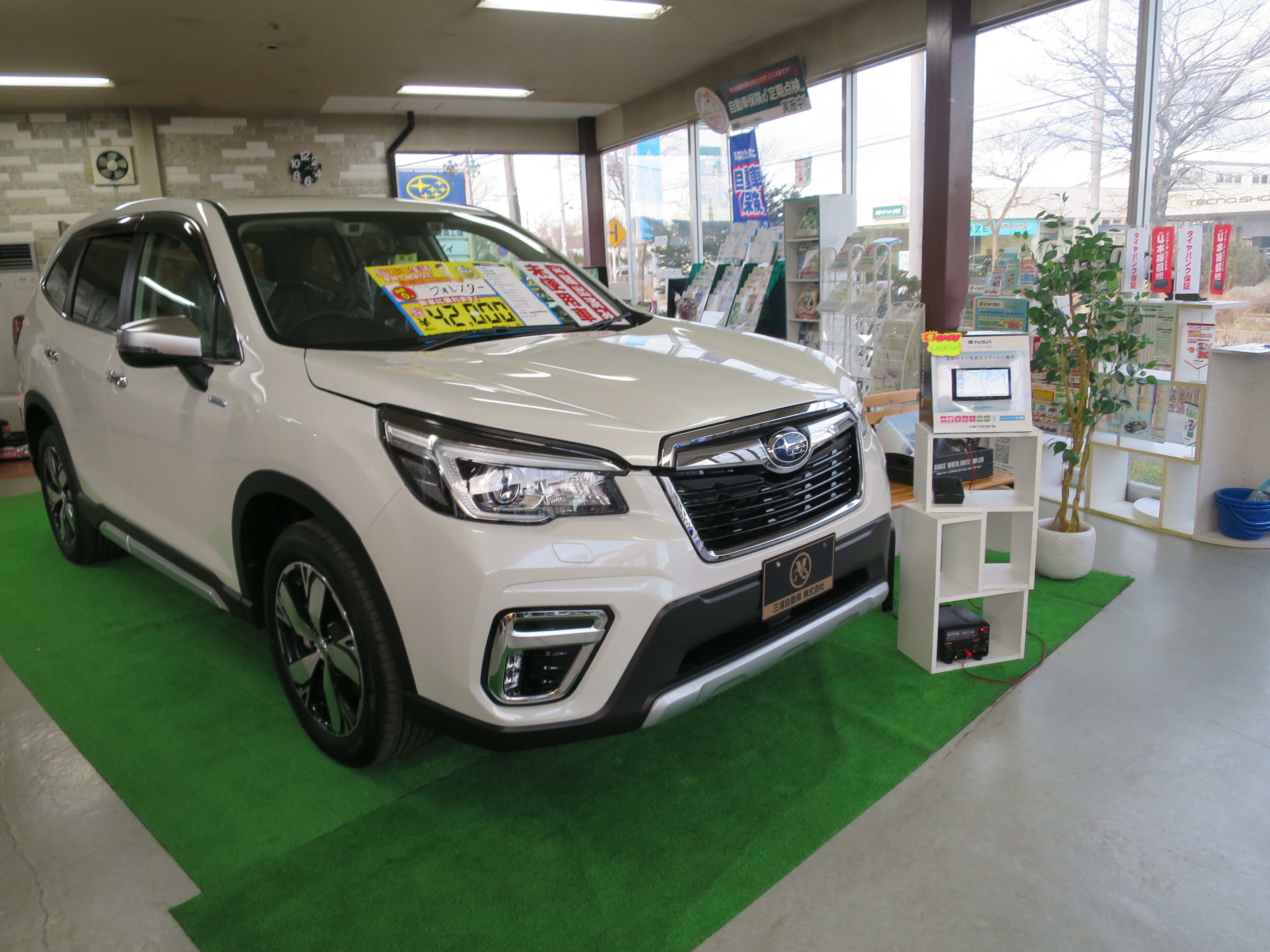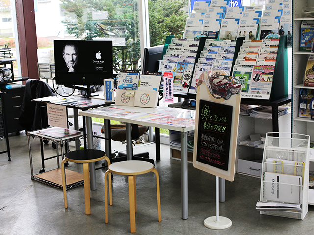ショールームも広々としており店内には新車も展示してございます。いろいろな商品もサンプル品含めご用意しております。