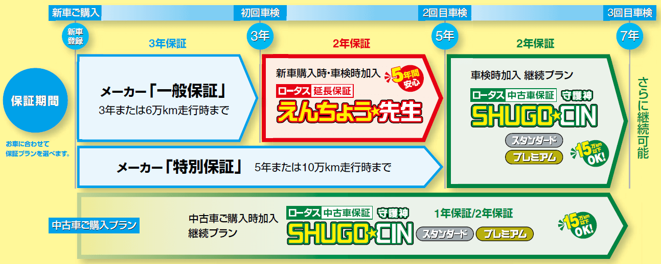 ロータス延長保証「えんちょう☆先生」は、新車3年後に終了してしまうメーカー「一般保証」を、さらに2年間延長します。新車ご購入時と初回車検時(15万㎞以下)に、ご加入できます。